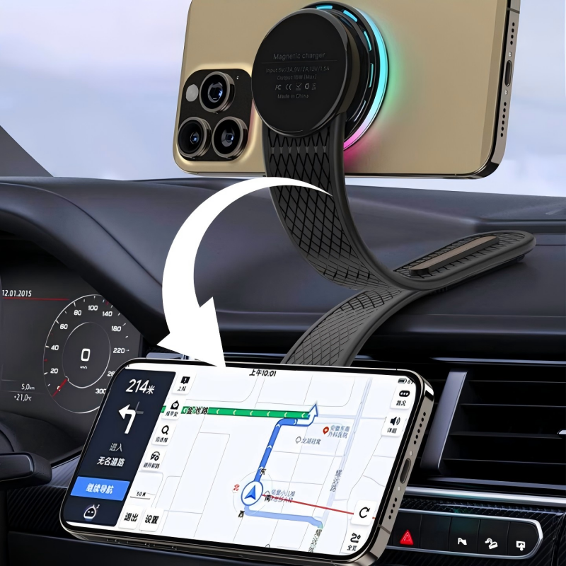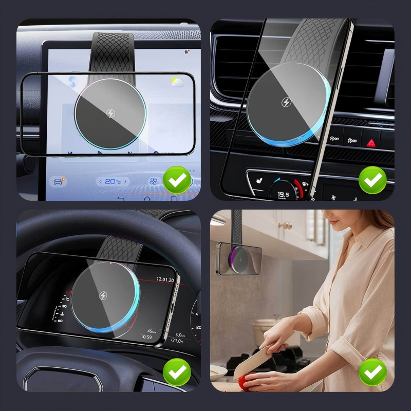 MONTAGGIO FLESSIBILE PER QUALSIASI TIPO DI INTERNI: Attaccalo ovunque — cruscotto, consolle o superfici inclinate — senza bocchette, senza morsetti, senza limiti. Perfetto per tutti i modelli di auto.