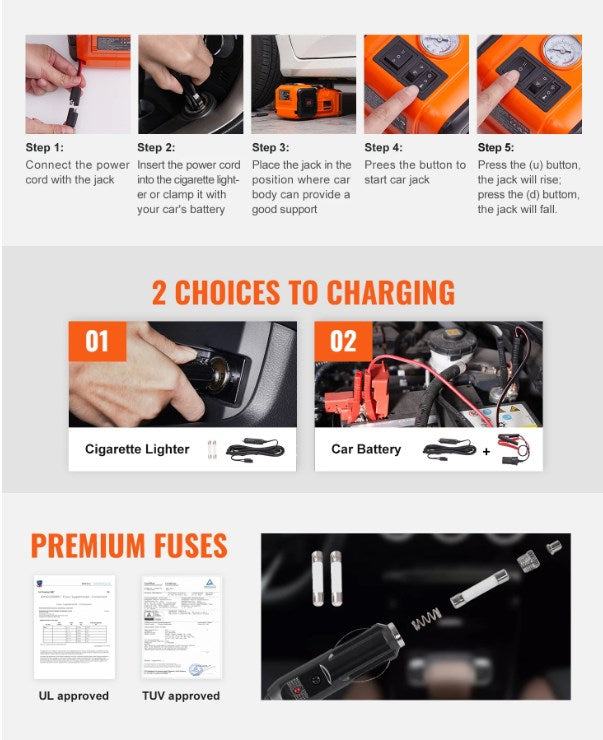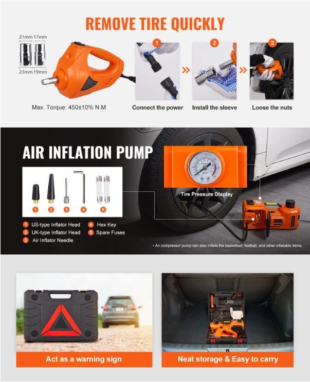 Se la tua auto ha una gomma a terra durante un viaggio, questo cric elettrico ti offre un supporto impareggiabile. Il motore potente solleva facilmente il veicolo in meno di un minuto, mentre il compressore d’aria integrato gonfia rapidamente il pneumatico. È uno strumento più rapido e comodo per le riparazioni di emergenza delle auto.